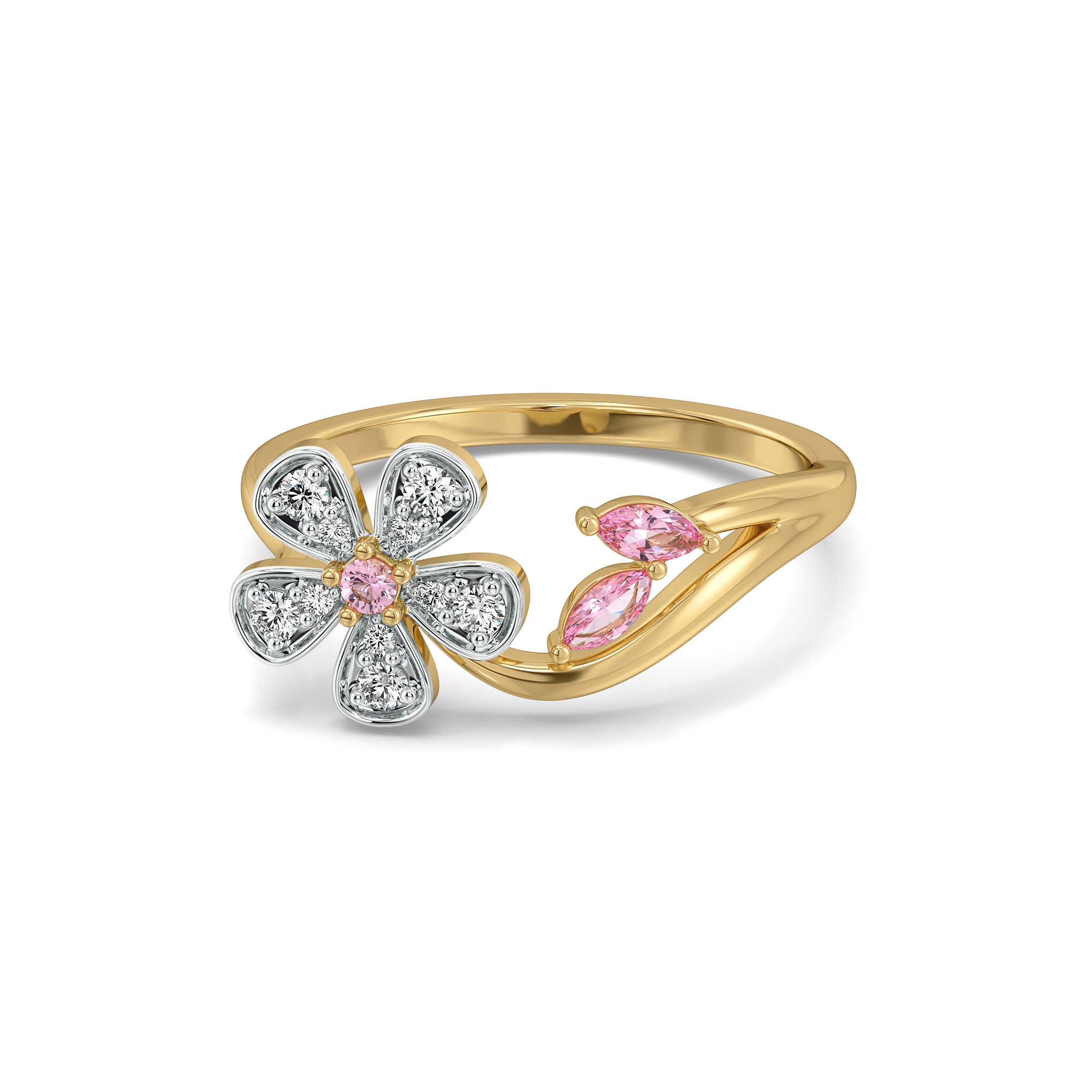 The Branch of Bloom Ring for women brings the poetry of a blooming branch to your fingertips. A detailed gold stem wraps gently around the finger, leading to a pink sapphire gemstone at the center of a floral motif. Lab-grown diamonds add a soft glow to each petal, while pink sapphire leaves complete the natural, feminine charm of this 18kt Gold Vermeil piece.