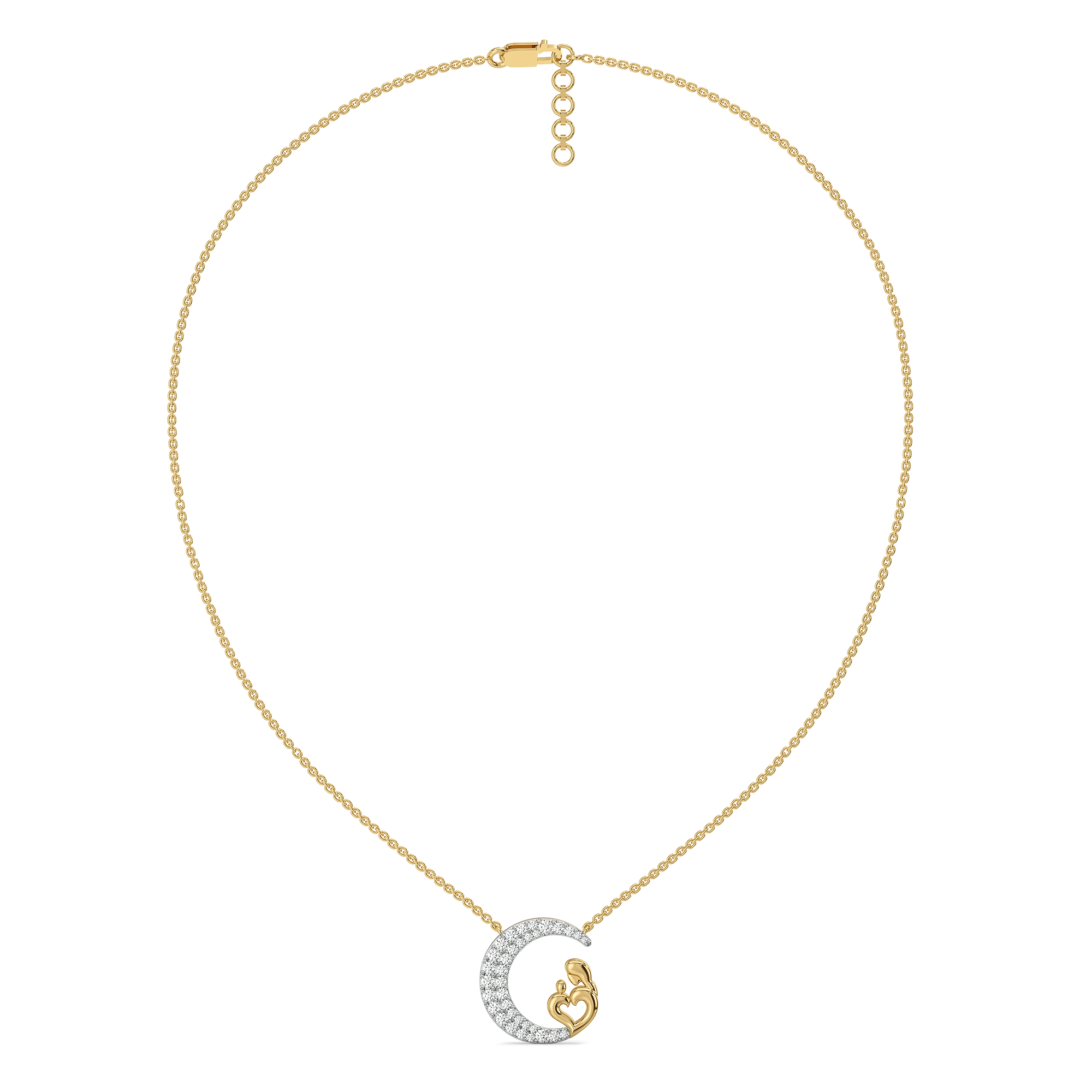 The Mother Moon Necklace celebrates the light that never fades — a mother’s love. Crafted in 18K gold vermeil, the crescent moon cradles a mother-and-child motif, symbolizing care, protection, and infinite connection. The curve of the moon is traced with lab-grown diamonds, each one glowing softly like starlight on a serene night.