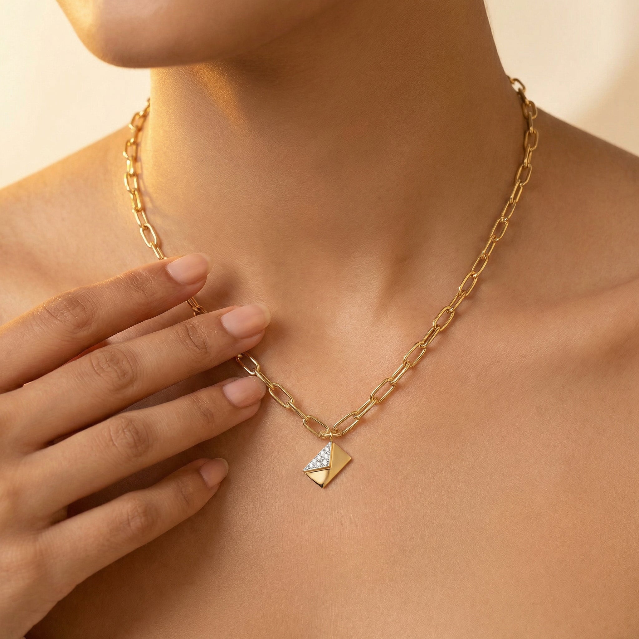 This charming envelope-inspired pendant in 18kt Gold Vermeil features sparkling lab-grown diamonds and a hidden engraving of “I love you” on the back. Designed for women, it’s a subtle yet meaningful way to carry a message of love, blending timeless elegance with a personal touch.