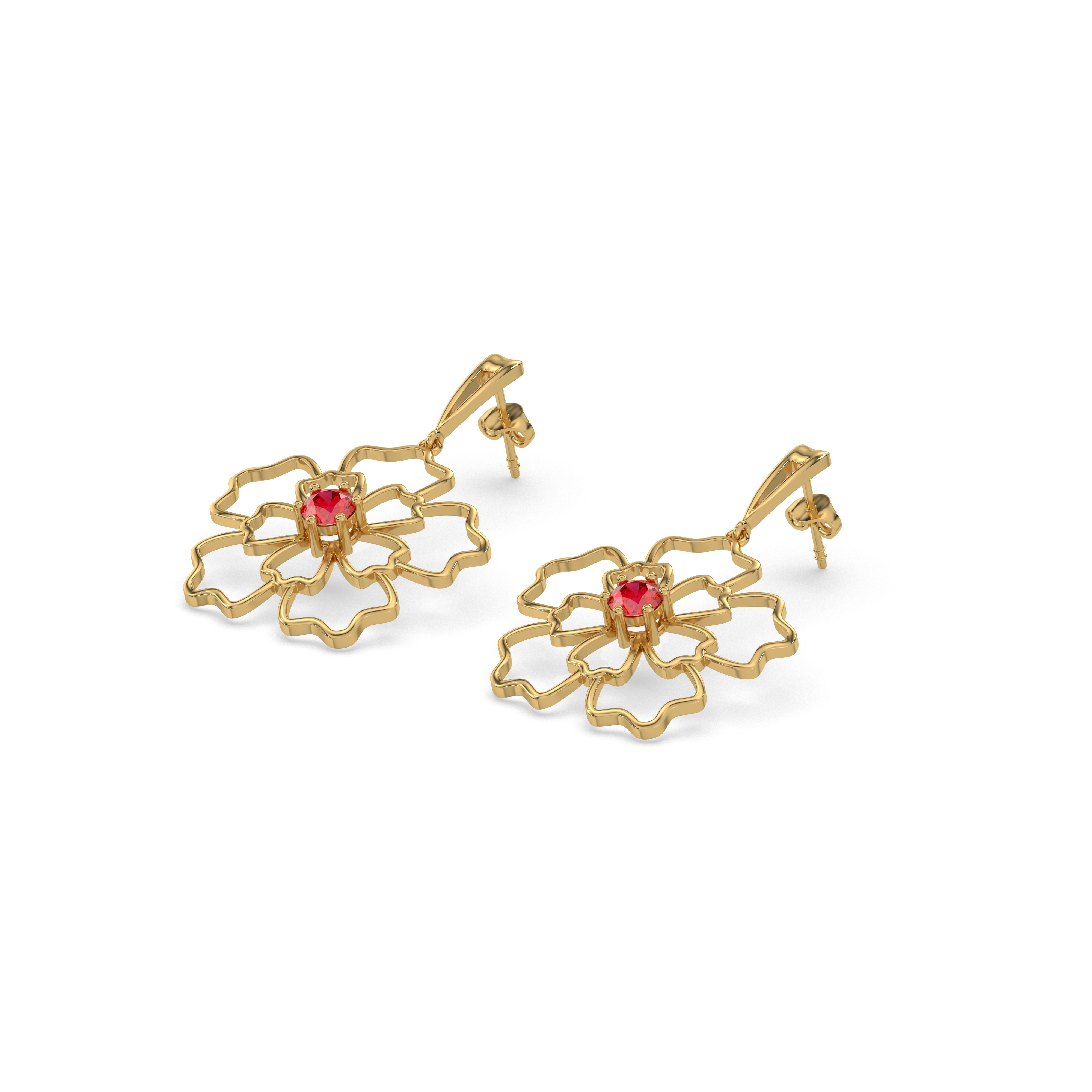 Embrace timeless charm with these exquisite Crimson Bloom drop earrings, featuring a delicate floral design brought to life with vibrant rubies at the center. Crafted in 18kt gold vermeil, they cascade gracefully with every movement, showcasing intricate petal detailing that captures the beauty of blooming flowers.