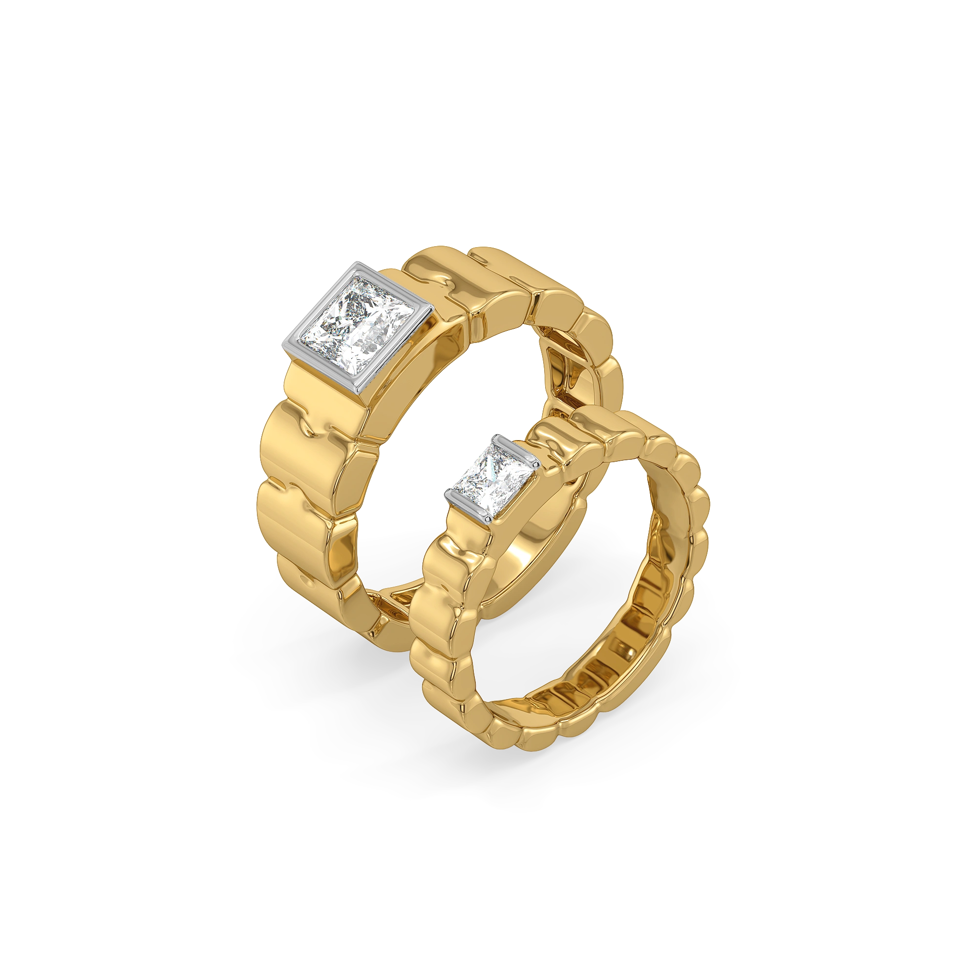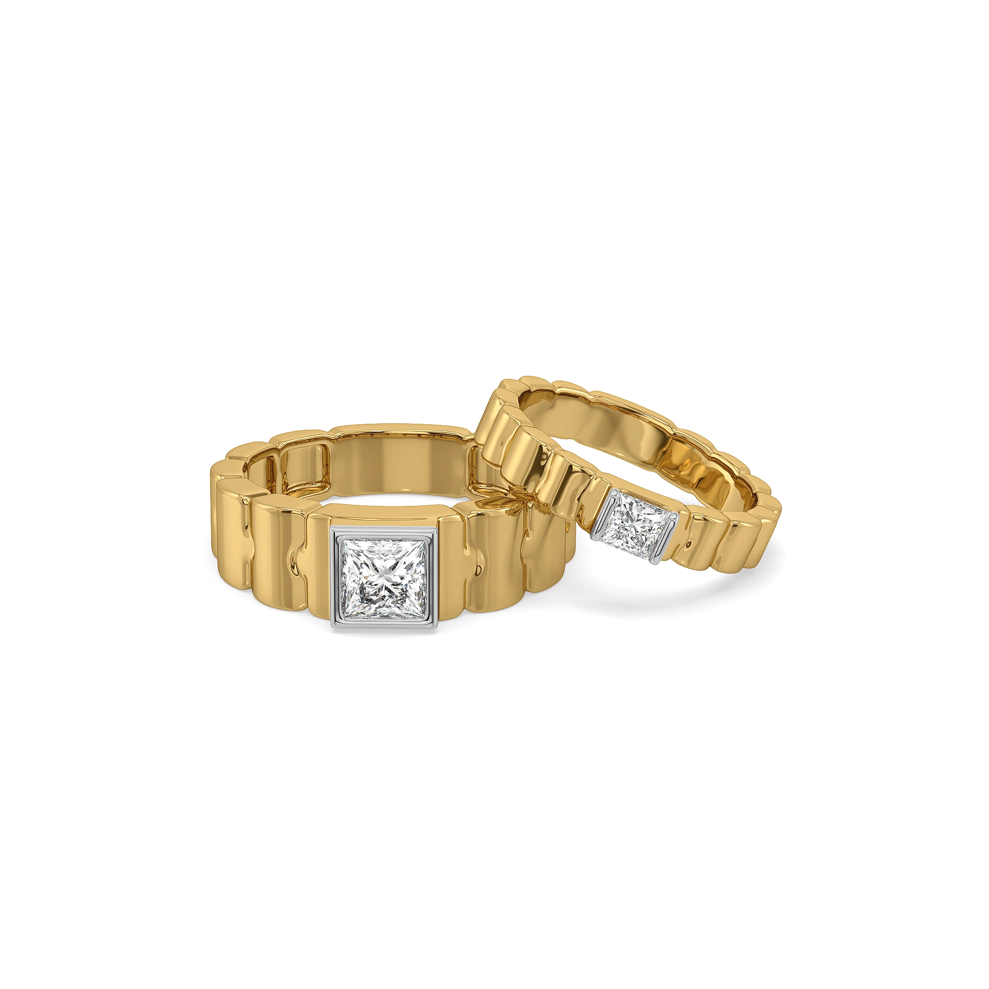 Designed for men and women who prefer bold, confident expressions of love, the Regal Square Bond Couple Bands feature a striking princess-cut lab-grown diamond that reflects strength and commitment. The solid band profile gives this design a powerful, modern edge.