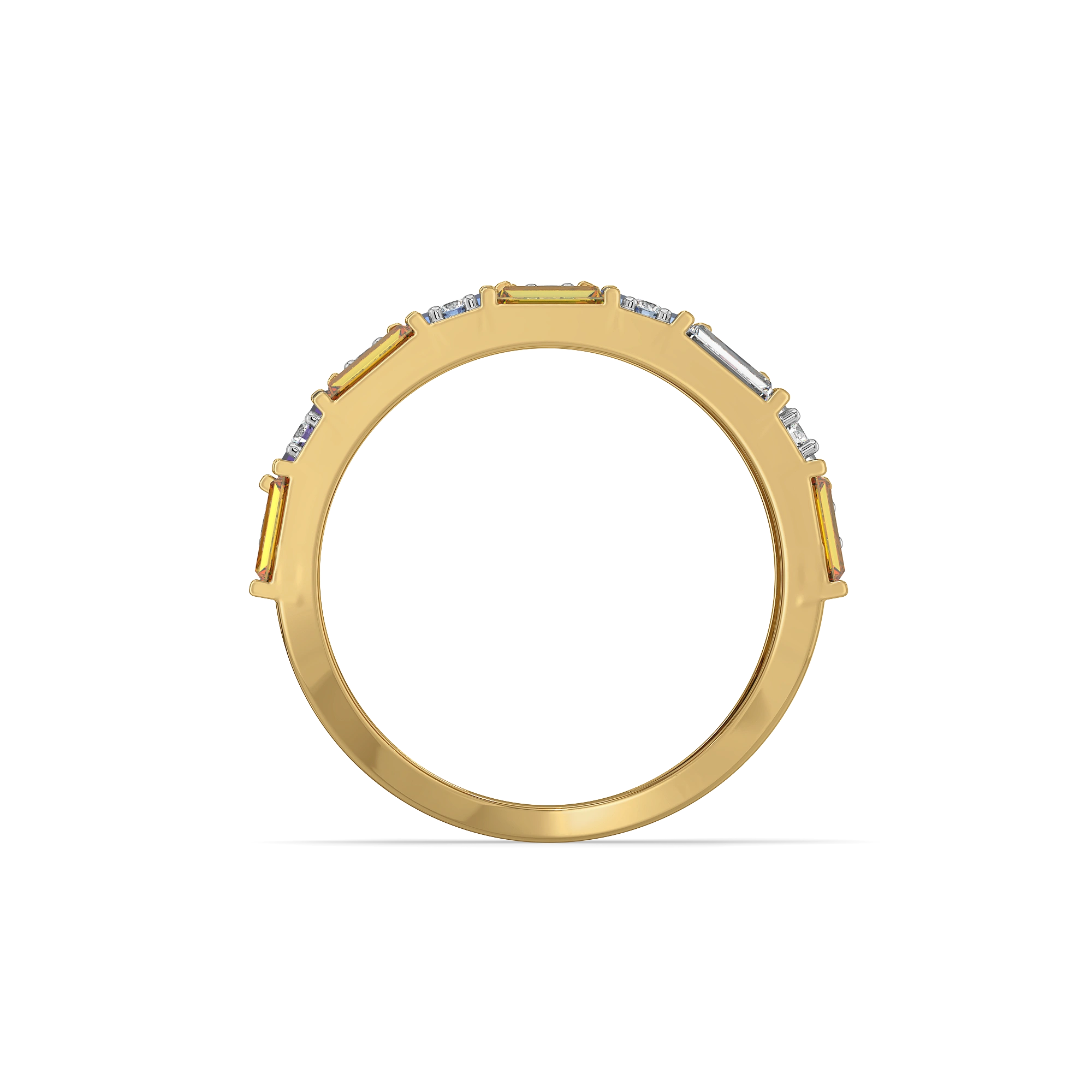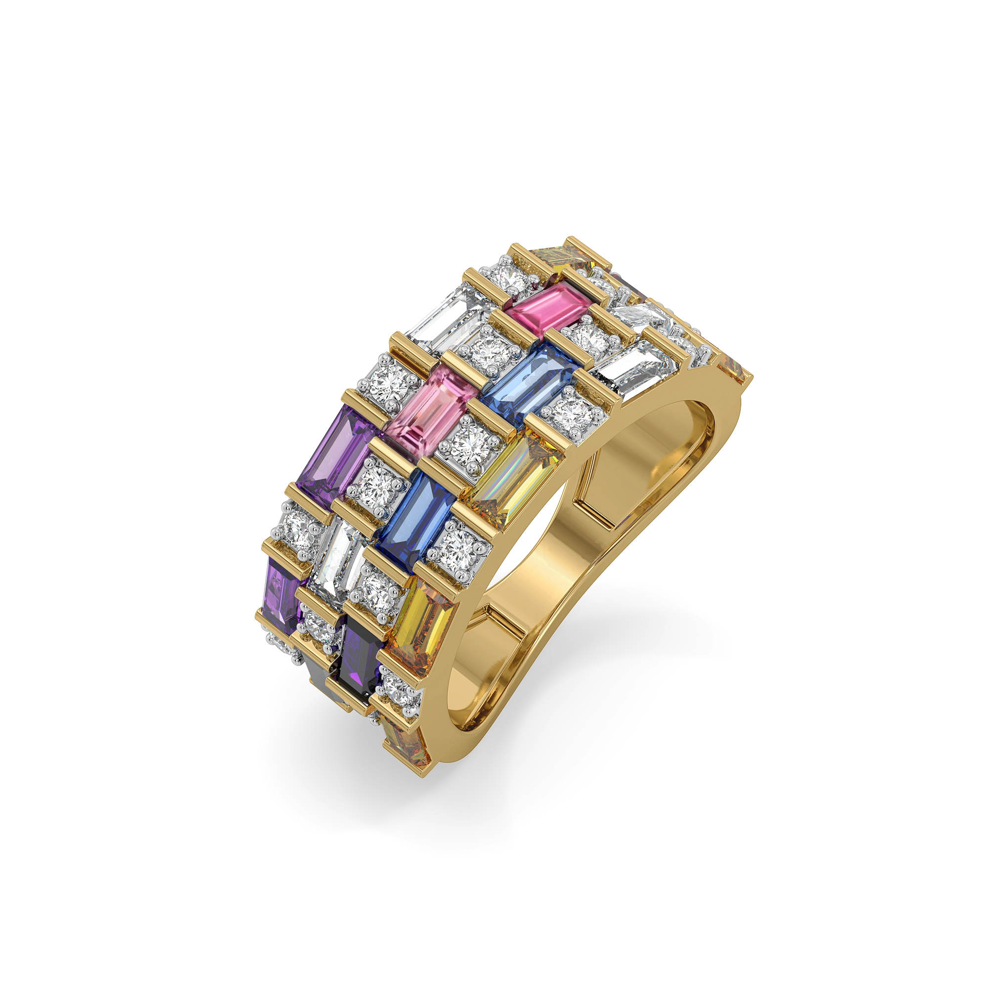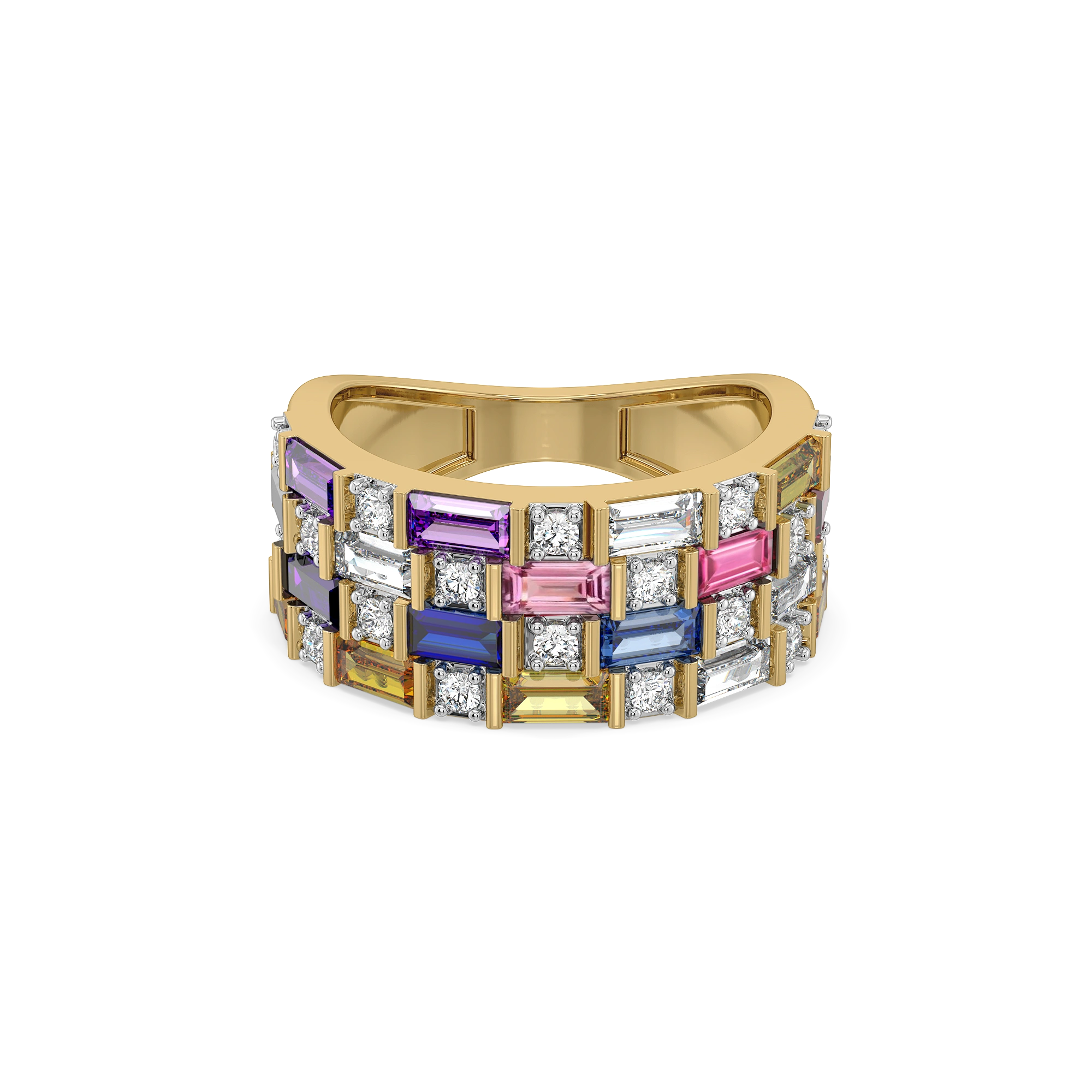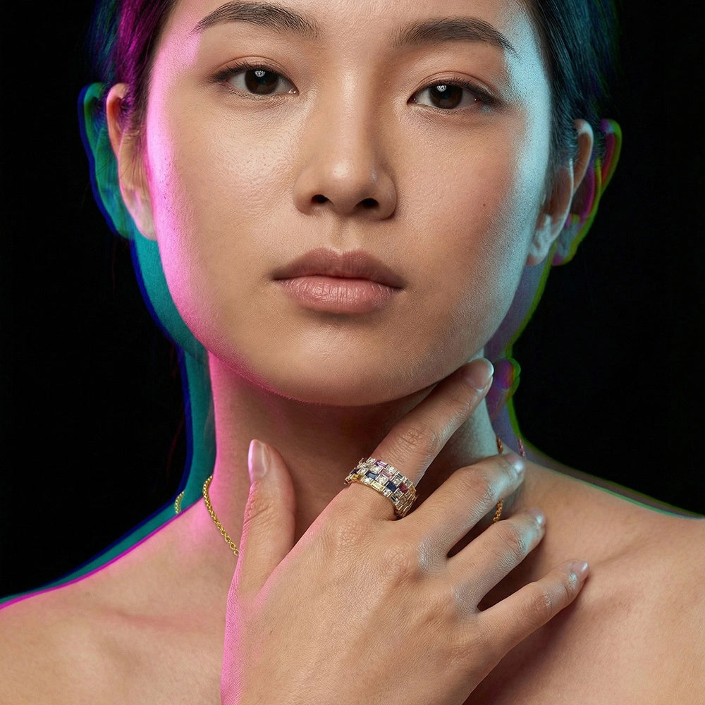 A bold clash of colour and rhythm—like a digital glitch frozen in time, where every gemstone and lab diamond falls slightly off-beat yet perfectly aligned. Designed for women who love edgy statements, this stacked silhouette creates a striking, almost hypnotic visual play.