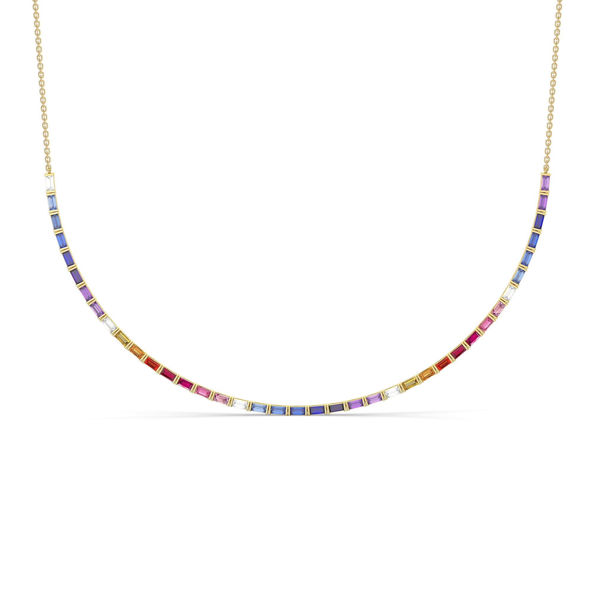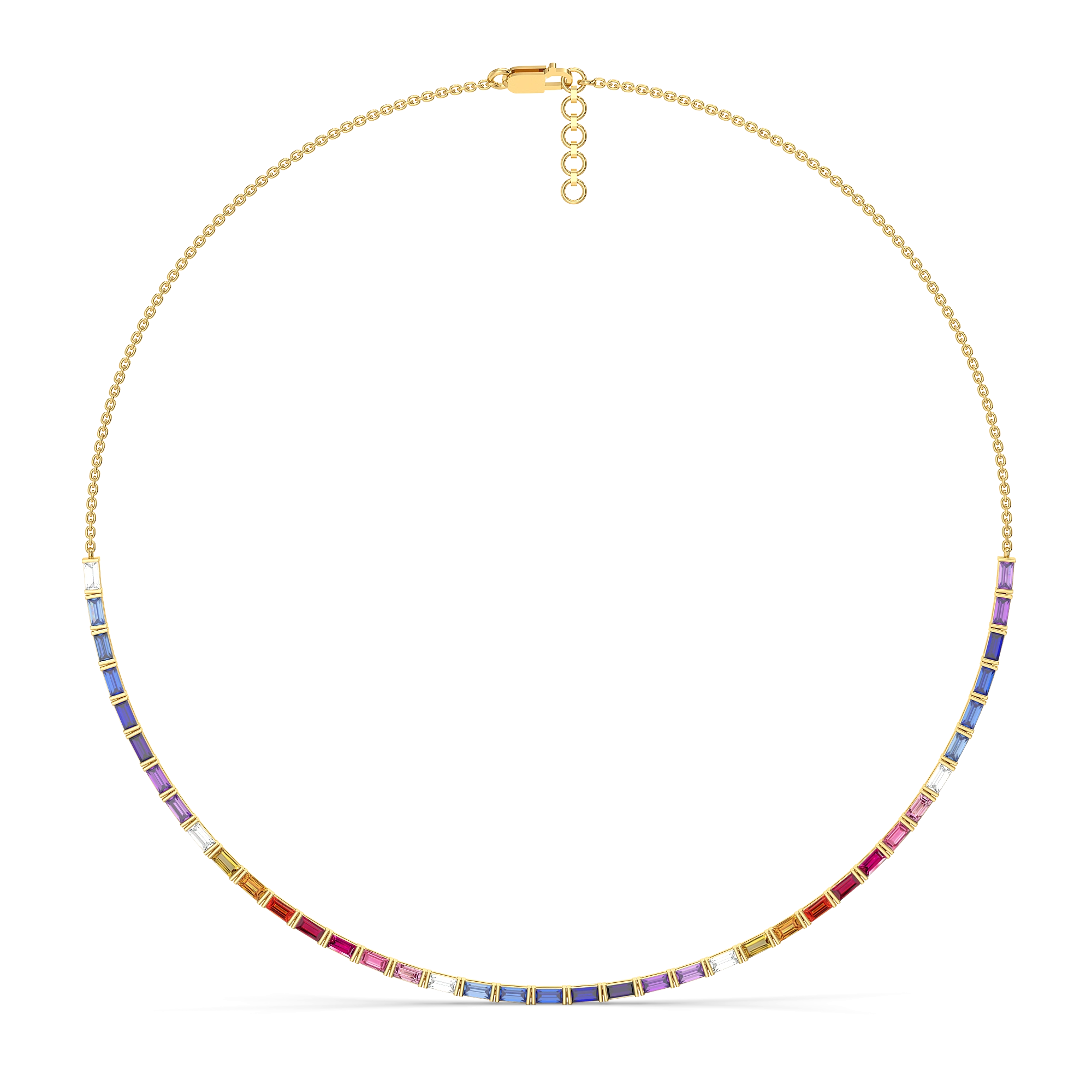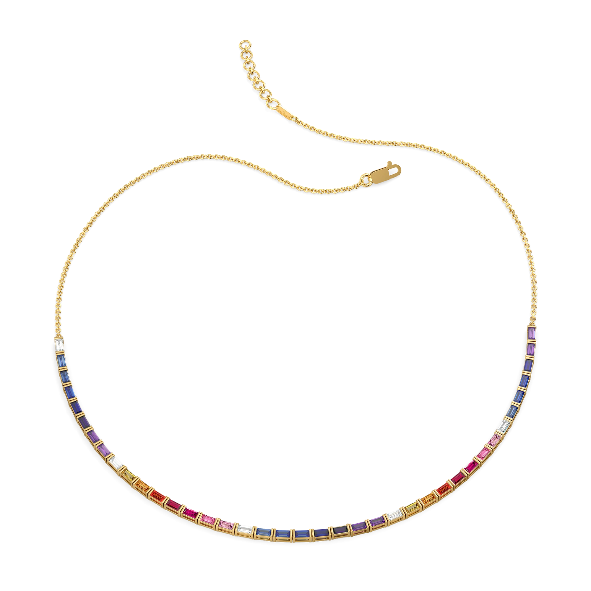 A fluid arc of colour that sits gracefully along your neckline—each gemstone transitioning into a lab diamond, creating a soft yet striking play of hues like a sunset fading into twilight. Designed for women who embrace bold expression with refined design, this necklace is both playful and powerful.